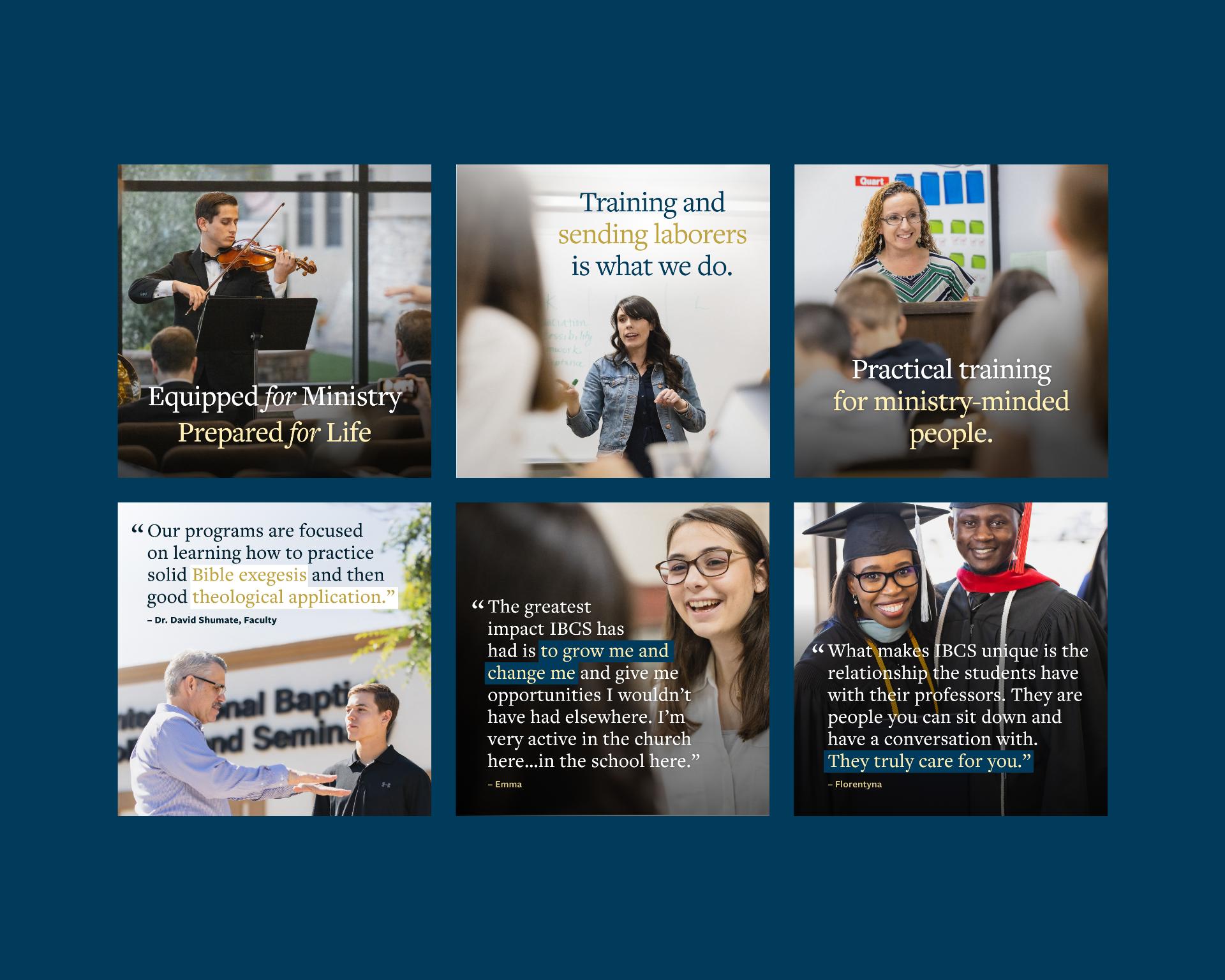 IBCS's strength has always been its focus on one-on-one mentorship, and this came out in the surveys we conducted with both leadership and students. Unlike other colleges, every IBCS student is assigned a mentor when they begin, and the concept of mentorship for ministry is woven throughout every program, providing a practical, real-life balance of experience to classroom teaching. We brought this unique advantage to the forefront in clear, simple tagline as well as integrating it as the central theme across their purpose and vision statements.